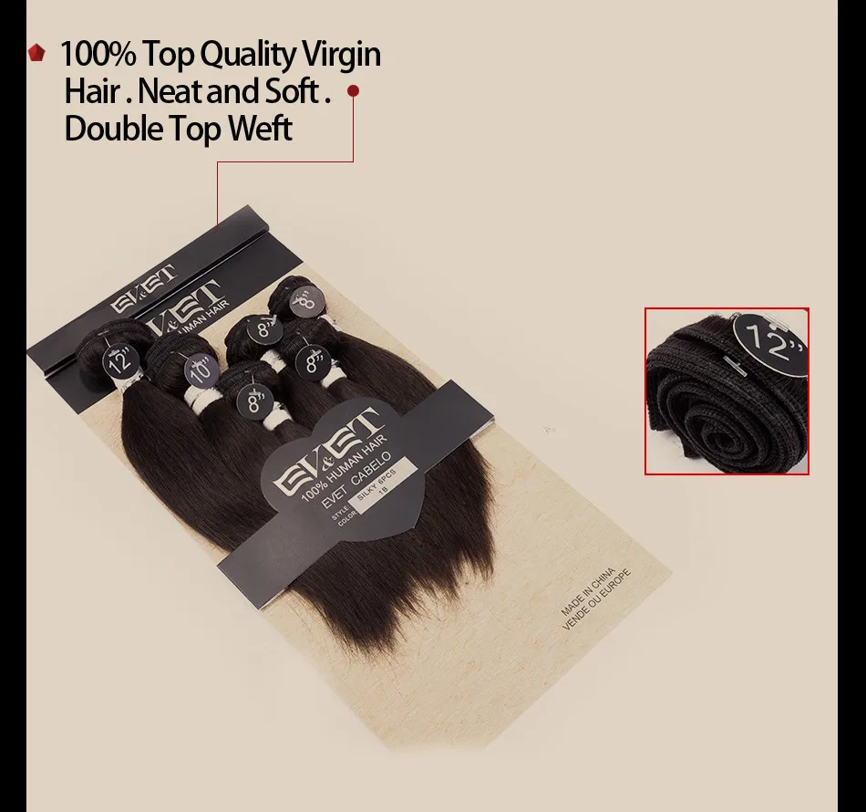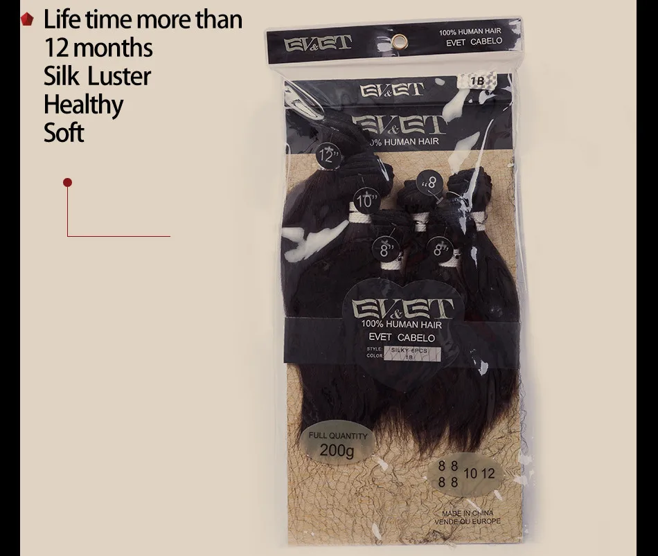 EVET Silky Straight Brazilian Virgin Hair Extensions 6Pcs Virgin Silky Straight Human Hair Weave 4x8",1x10",1x12" 200g/Pack #1B #2 #4 Suggestion: This hair set is basic for full hair, it is thin !!! 2 set will be enough for a complete full hair, So Please buy 2 Sets. 1.Material: 100%HumanHairExtension,UnprocessedVirginHair 2.Advantage: 1.)Tangle-Free,noshedding. 2.)Doubleweft,verysoft,veryprettyfastshipping. 3.)Nolice&grayhair,nobadsmell,keepwaveafterwash. 4.)Canbedyedandbleached. 3.Haircolor: Naturalblack(#1B)Darkbrown(#2)Lightbrown(#4) 4.Hairlength: 8" 10" 12" instock,canbeCustomized8to30 5.Hairstyle: SilkyStraight.
