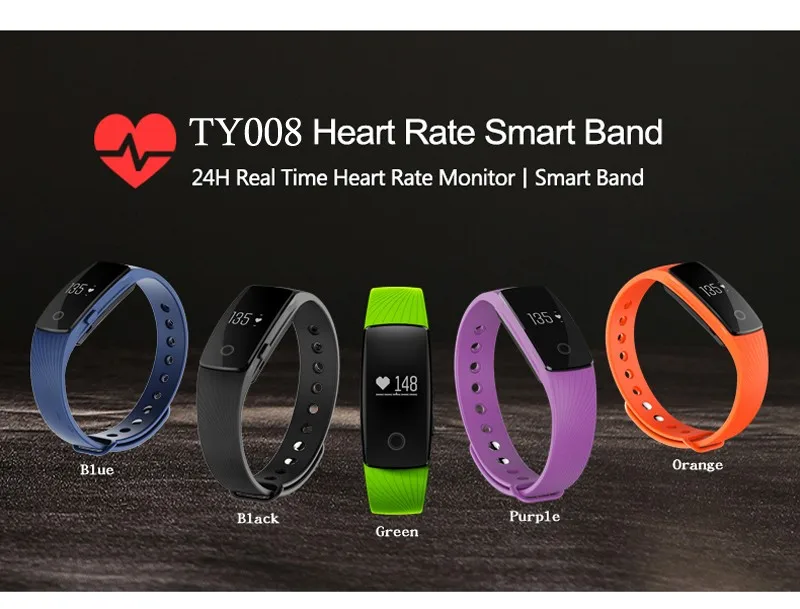 Feature: Heart Rate Smart Band 24H Real Time Heart Rate Monitor Smart Band TY008 adopt green LED lights (OSRAM lights) and sensitive Photo-diode to monitor the flow of blood through user\'s wrist every single moment. When user\'s heart beats, there will be more blood run through user\'s wrist, the green light absorption will increase. Under the interval of heart beats, less blood run through user\'s wrist, thus the green light absorption decrease. DO Researching and Developing Team have effective monitored and extracted heart rate signal based on developed a set of complicated and explicit algorithm