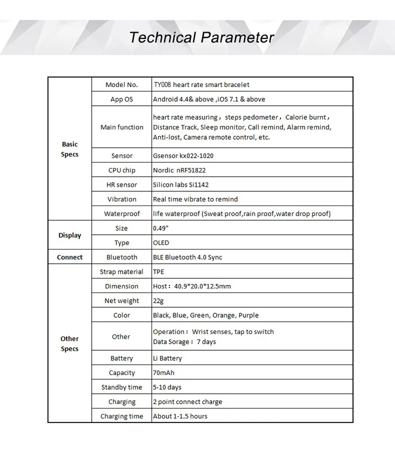 | Basic Specs | Model No. | TY008 heart rate smart bracelet |
