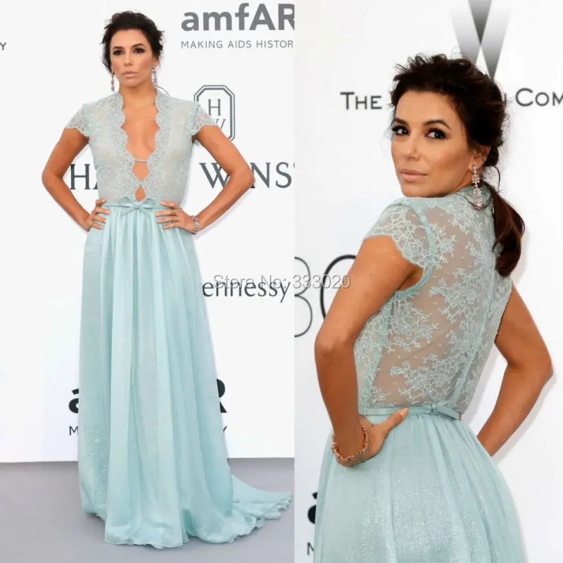 Eva Longoria Evening Dress 2015 Amfar Awards Gala Cap Sleeve Plunging Scalloped Neckline Sheer Back Mint Green Formal Prom Gown 2. Waist =