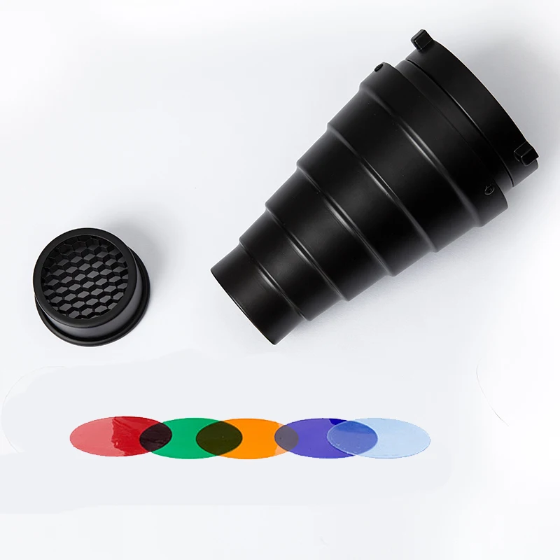 Photo Studio Vedio Photography Accessories Snoot & Honeycomb for Bowens Mount Flash Strobe Features: Brand NEW. Metal Body. Include honeycomb. Comes with 4 Gel Filter Color (Red, Yellow, Green, Blue) Set. 3.94" (10cm) diameter with Bowens Mount. Ideal for monolights with Bowens Mount like Visico, Mettle, JTL, Godox etc. Notice: The Strobe in picture are not included; This item doesn\'t compatible with Bowens Gemini series. Package Contains: Metal Snoot with Bowens Mount x 1; Honeycomb x 1; 4Gel Filter Color (Red, Yellow, Green, Blue)Set x 1.