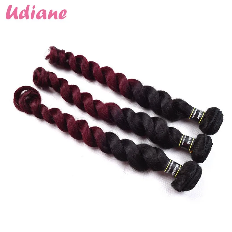 Brand name:U Diane Hair Product:Brazlian ombrehair extensions,tone tone 1b 99j ombreloose wave and we also supplyIndian ombre hair extensions,Malaysian ombrehair body wave,Peruvian ombre hair weaves,mongolian hair. Style:Ombre Brazilianloose wave we also have large quantity straight ombre hair extensions,ombrePeruvian loose wave hair weaving, Brazilian ombre curly hair,Brazilian ombre kinky curly hair weft,and natural color deep wave,afro kinky curly yaki straight,afro culy,deep loose hair Material:100%human hair extension Length:10",12",14",16",18",20",22",24",26",28",30", Accept customization Weight:Net weight 100g(±3g) per piece Color: 1B 99j Dark root two tone ombre hair we also provide1bburgundy,1b 99j,red wine,1b 27,1b 613,1b 4 27,1b 4 30 Available colors:1b/27,1b/30,jet black 1#,strawberry blonde27#,3 tone 1b 4 30,mediumauburn 30#,dark brown4#,1b 613 Quality:No shedding, tangle free, soft, clean, thick and smooth Package:PP/PVC Bags. Shipping:Usually by DHL free shipping. Normallyu can get it within 3-7 working days.