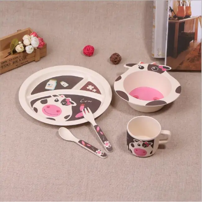 New 100% bamboo fiber children tableware 5 pieces dinnerware feeding set Plate bowl cup Forks Spoon with animal zoo baby printfree shipping NAME: Set of 5 pieces bamboo fibers children\'s tableware STYLE: YR062K MATERIALS: bamboo fiber / starch / rice husk / Bran TEMPERATURE: -20 ° -100 ° REMARKS: Do not put microwave oven or oven Tableware instructions A. Before use, please use warm water or hot water to wash it B. Do not put in a microwave oven, oven, disinfecting cabinet and Cook it in boiling water C. Parents need to be Guardianship during babies use D. In addition to food requirements, please do not use in other areas