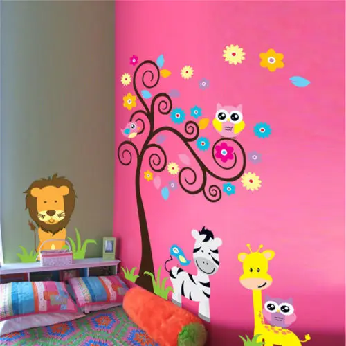 Non-toxic,environmental protection Brand new, Fashion Design and High Quality. Material: PVC/Vinyl Typed Size:60*90cm Finished Size about:90*120cm Package:1PC Forest Animals Giraffe Zebra Owls Birds Lion Flower Tree Wall Sticker Note: When you receive the sticker, it is rolled up in the tube. However it is easier to work with when the sticker is flat. So please use hard flat things to lay on it to flat. Begin to stick on your wall when it is flat enough. And follow the steps as below: