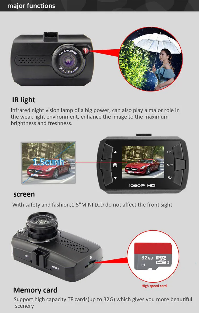 Special Function: Motion detection, Loop recording, Auto power on/off Max External Card Supported: TF 32G (not included)