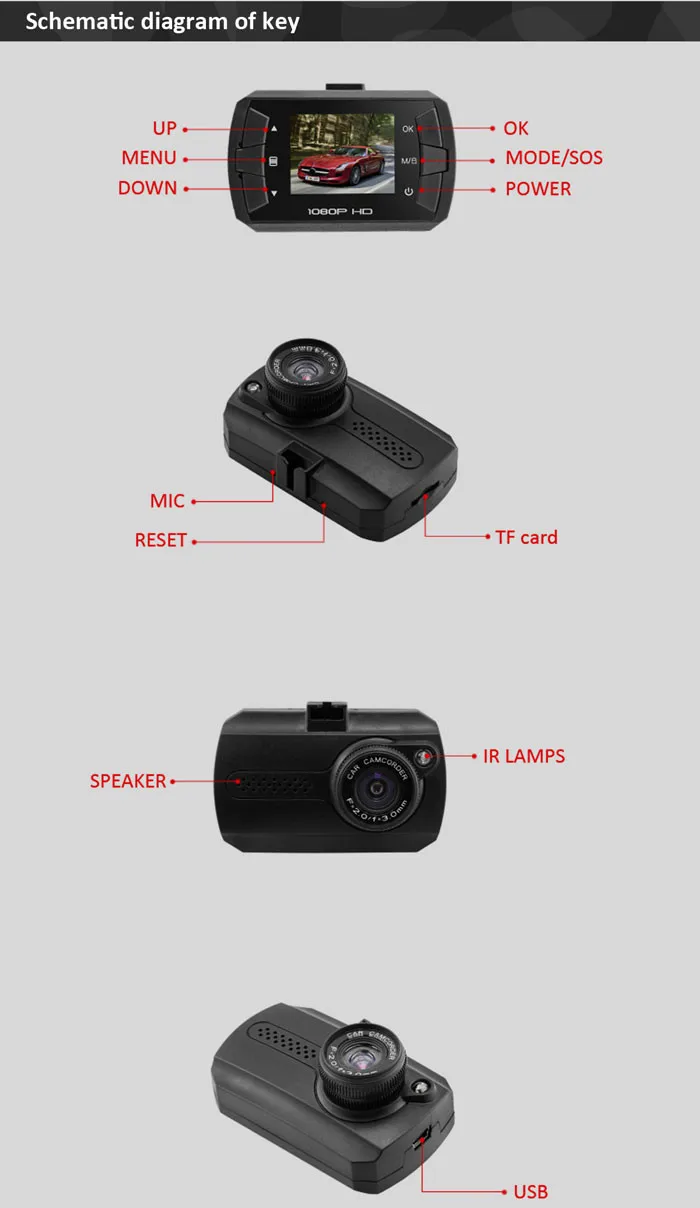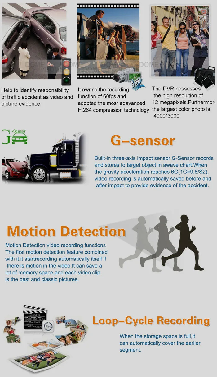 Charge Way : Car charger, USB charge by PC Wide Angle: 140 degree wide angle Decode Format: H.264