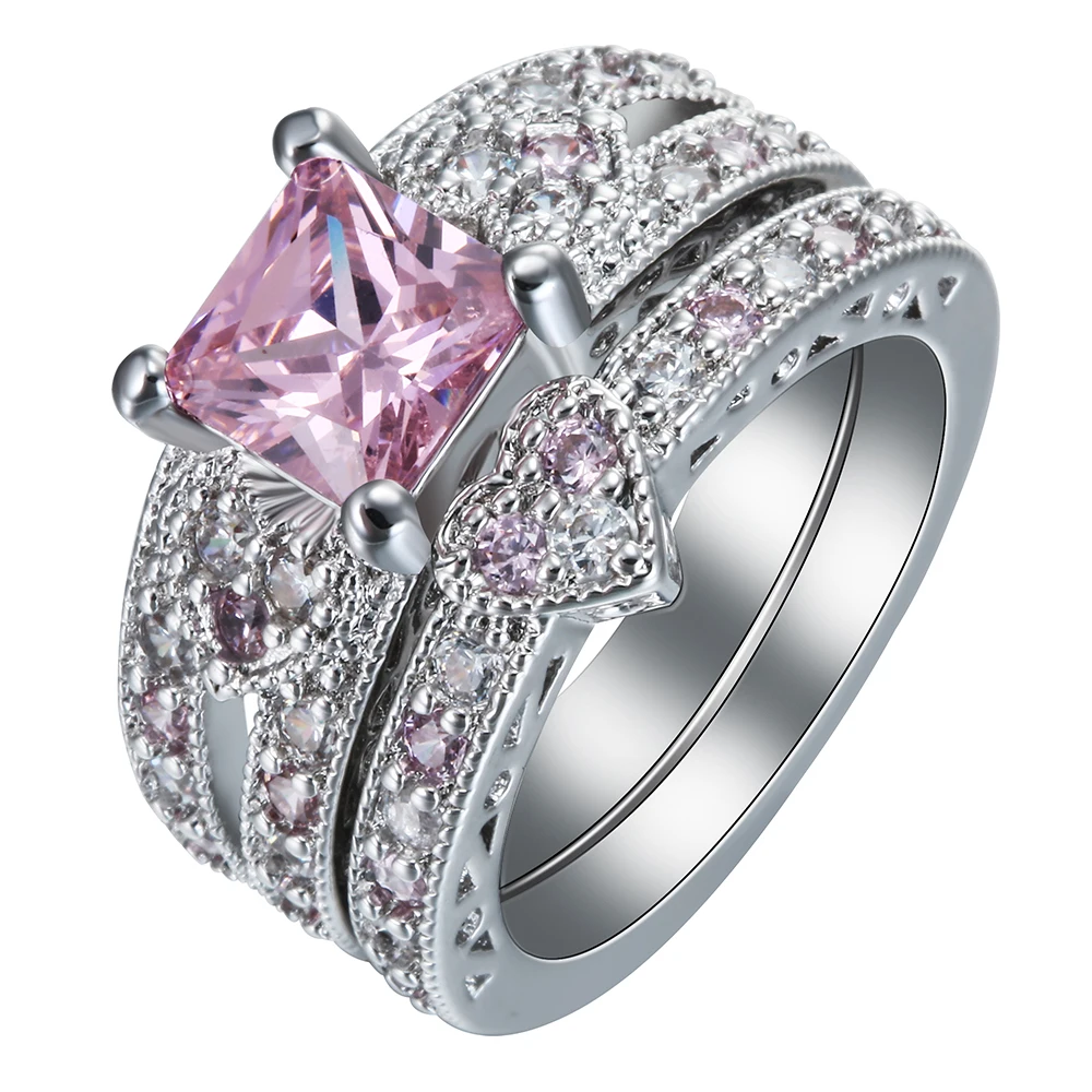 silver plated ring set heart shape black gold color ring pink blue green cz paved white zircon cut modern design rings jewelry