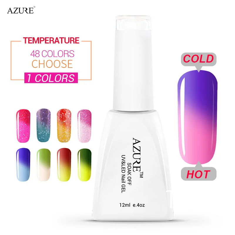Temperature Color Change Nail Long-lasting High quality Nail Gel Polish 12ml 1 pcs LED UV Gel Nail Art Note:1>Choose any color you want,state the color number by leaving massage2>Sincethis is a big promotional product.So we choose the ordinary delivery,no tracking information.Under normal circumstances, the arrival time reach time about: 30--60 days. Features *A professional Nail Art Gift for yourself or your girlfriend * Best quality control to ensure high quality polish *On like polish, wears like Gel, off in minutes *It offers the widest color range for customer to experience professional soak-off nail art in a reasonable price * Long lasting for at least 14 days, fantastic and super bright nails for you. * No more imperfect surface, dents or nails cut. Color resistant, flexible and shiny resistant to any test Specifications: Brand New: AZURE Type: Soak-off UV Gel Polish Model:T01-T60 Net WT:12 ml Effect: Color-Changing with temperature Package list: Temperature gel * 1