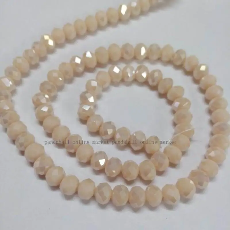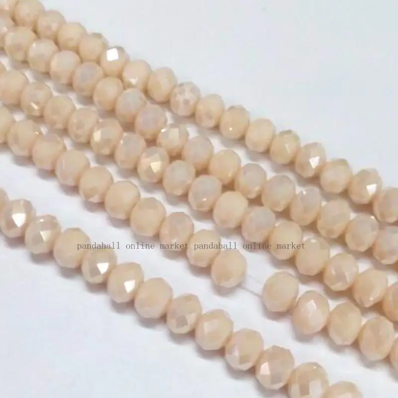 Electroplate Opaque Solid Color Crystal Glass Abacus Beads Strands, Faceted, AB Color Plated, Bisque Size: about 6mm in diameter, 4mm thick, hole: 1mm, about 95pcs/strand, 16.9". These glass beads are processed by electroplate technology, which can reflect dazzling light. Lovely colors and well-polished appearance win immediate popularity. It is widely used during jewelry design or even costume design. If you like fashion design, don\'t miss these charming glass beads.