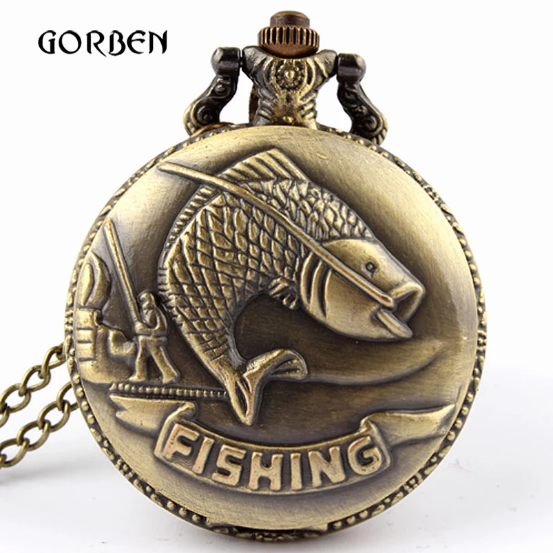 Fashion Bronze Vintage Pocket Watches Necklace chain pendent Fishing Angling Antique Quartz Pocket Watches Mens relogio de bolso