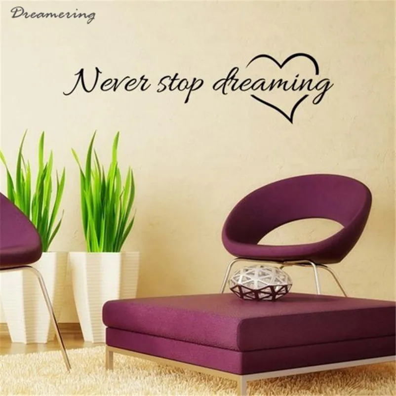 Never Stop Dreaming Removable Art Vinyl Mural Home Room Decor Wall Stickers Feature: 100% brand new and high quality. Quantity: 1 Size:About 57cmX15cm/22.4\'\'X6\'\' Material:PVC Color:Black Can be applied to any smooth surface, such as glass door, window pane, ceramic tiles in kitchen or bathroom, glasses, home appliance, air-condition, and car body How to use:Choose a smooth, clean and dry surface. Peel the stickers from the sheet one by one Position the adhesive on a plane surface without pressing them, so that it let\'s possibility to withdraw them and reposition again,if needed. If the result is satisfactory for you, stick firmly to the surface pressing the air bubbles outwards. If you have bubbles, take a needle to bore them. Clean the smooth surface before sticking it on