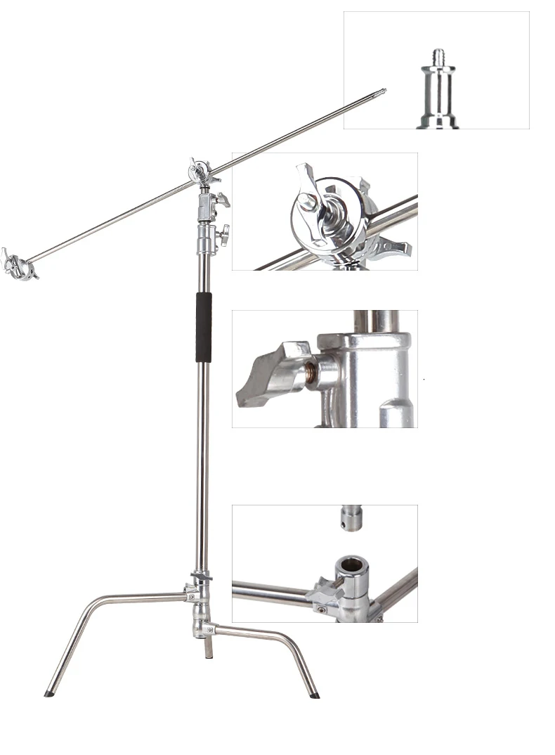 Pro heavy duty Studio Centry C Stand Detachable Light C-stand gobo Arm line Resizer For Flash Strobe Flag Reflector best cost performance C-stand choice for studio lights, Kino Flo fluorescents, flag reflectors, background. Features: Heavy duty & high stablity Detachable for portable carrying Strong steel material and enhance surface plated Specifications: Maximum operating height: 3280mm Min height: 1450mm Folded height: 1450mm Tube diameter: 35 / 30 / 25mm Net weight: 9.0kg Max load capacity: 10.0kg Pitch number: 3 Material: Steel Kit Includes: 1x Detachable C-stands ( base and column ) 1x Gobo arms 1x Line resizers