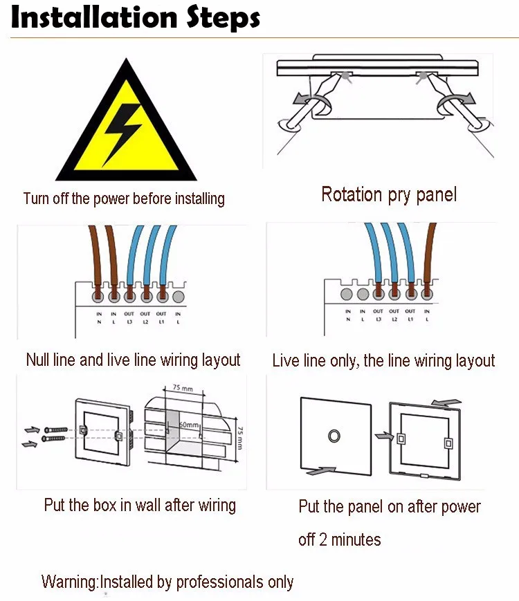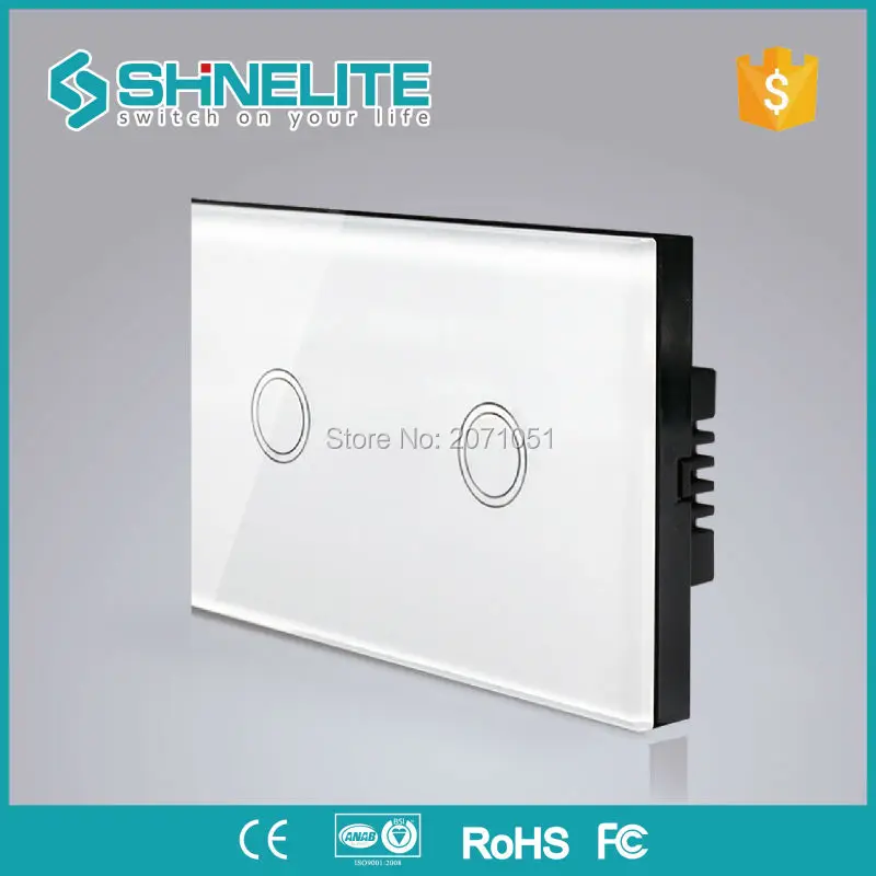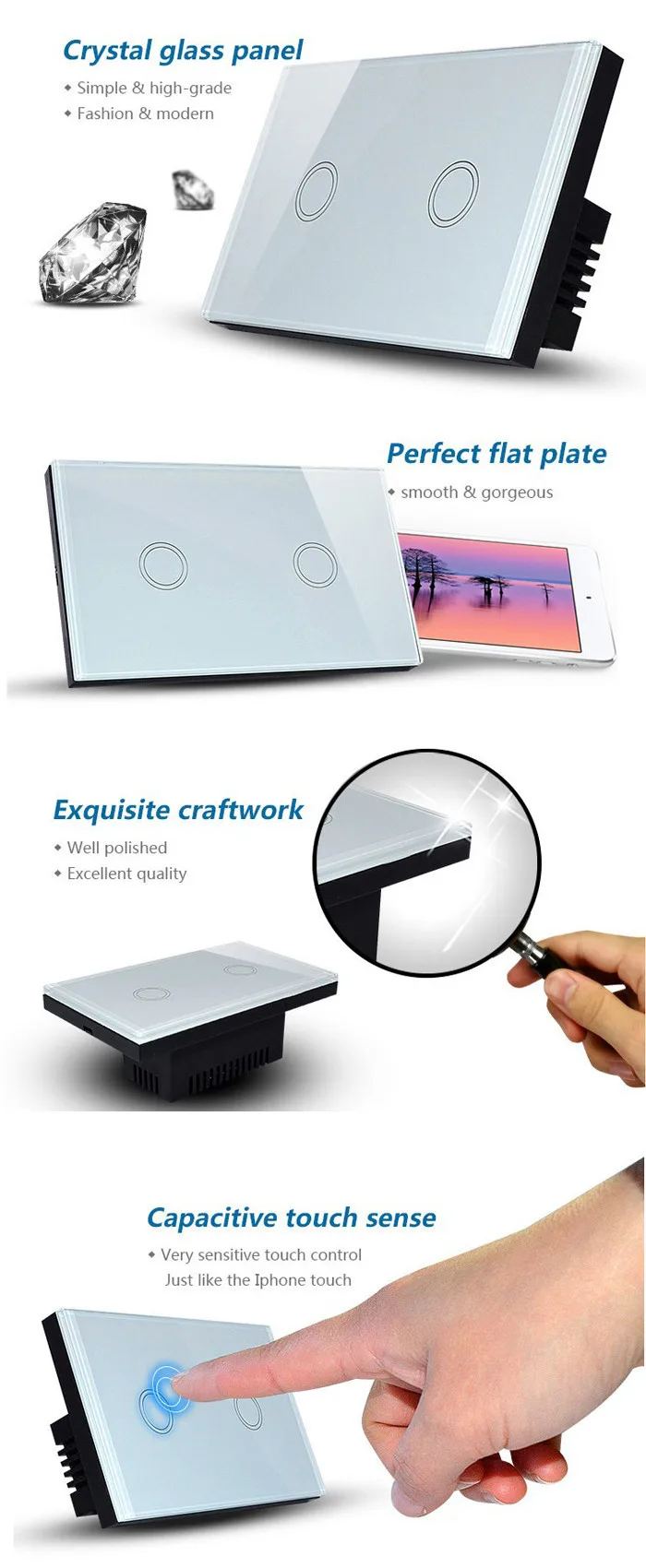 Shinelite,US/AU plug 2 Gang Glass panel domotica wireless wall switch,smart house home automation Touch control touch gsm light switch Product Description: High quality crystal tempered glass panel design, never fade. With blue LED indicator, very distinguished. E-start, no sparking contacts. Brand new imported American IC & capacitive touch sense, more superior performance & sensitive touch. Overload & overheat protections, make your home safer. More humanization design: the lamp is off when the incoming of electricity again, save electricity. Silent touch, keep your home or office silence. Single live wire control, easy to install, replace the old switch directly. Applicable to all the common lamps, such as incandescent, fluorescent lamps, led lamps and so on. Suitable for home, office, hotel, hospital and so on Specifications: Dimension: 120*72*42mm Operating voltage: 110-240VAC/50Hz~60Hz. Rated load: 5-300W/Gang Life long: more than 100,000 times *US Standard 2Gang Touch LightSwitch Have White & Black Color for Choose. Package included: -1x Touch Switch -1x Accessories -1x User Manual