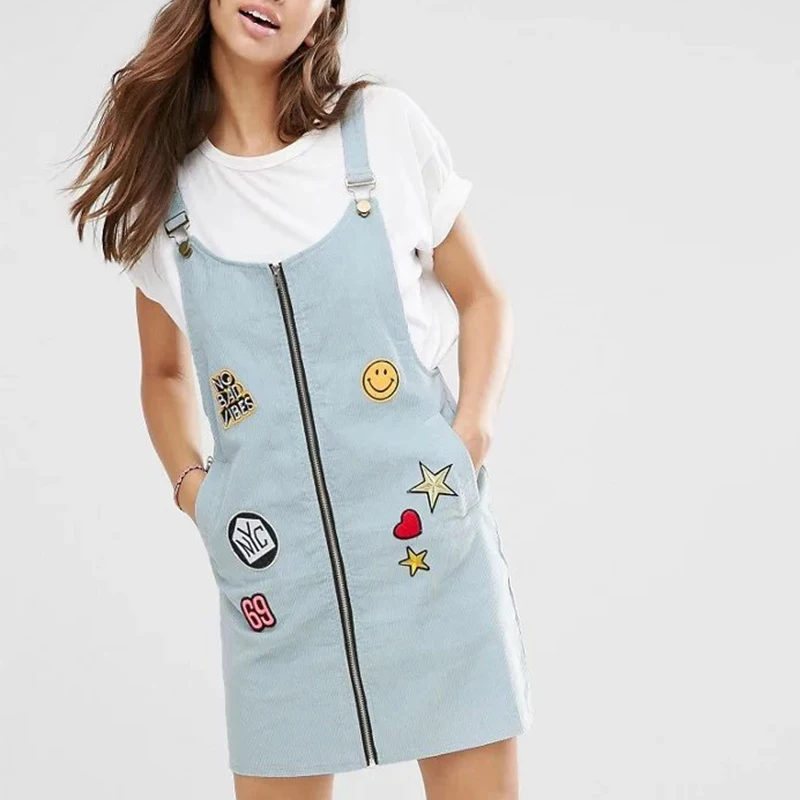 2 Color Cartoon Patch Design Badge Denim Strap Dress Women Summer Fashion Front Zipper Female Clothing