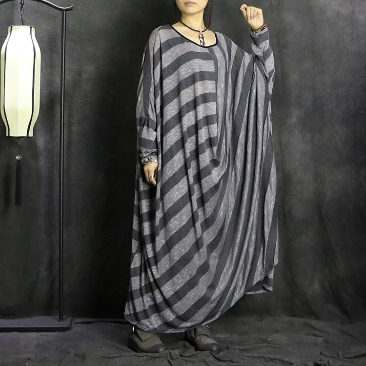product details Name:2016 female new autumn original design autumn plus plus size loose art longer paragraph bat striped dress Ingredients: knitted cotton Color: Gray Size: Free Length: 115cm, Bust: 208cm, hem: 200cm -3cm is normal Model: height: 160cm, weight: 46kg, bust: 86cm