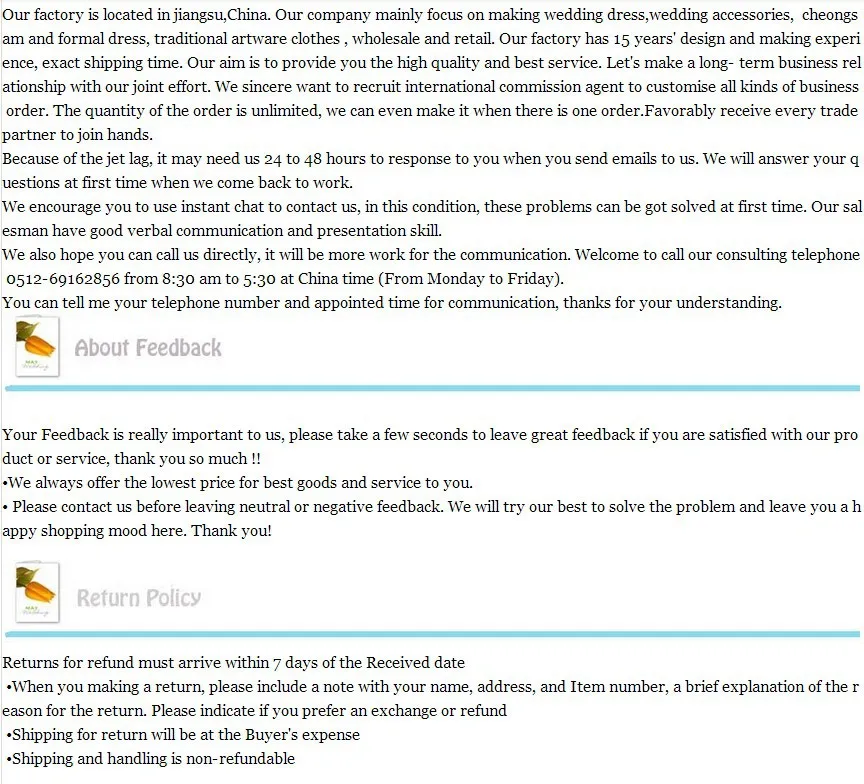 1. leave you event time,color number from our color chart. Dress can be custom made,you can leave your measurements and require like back want lace up or zipper,dress train want which meters. Veils can be custom made and need add money.Petticoat can\'t be custom made unless you buy dress from our store.Thanks. like: Dresses Bust:__cm waist:__cm hip:__cm shoulder to shoulder:__cm shoulder to knee:__cm sleeve:__cm arms eye:__cm Veils Length:--cm color:-- Event time:------ Petticoat Waist--cm Event Date 2.ifyouwantcolorsameaspicture,pleasealsoleavemessagetotell. 3.wecannotmakethedressexactsameasthepicture,pleaseunderstandthis,becausethatisnotourdesign,butwewilltryourbesttooffereveryclienttopquality. 4.Theweddingdressdoesnotincludeanyaccessoriessuchasgloves,weddingveilandthecrinolinepetticoat(showonthepictures).Biddingisforonedressonly! 5.Beforeordering,pleasereadthislistingcarefullyandaskallyourquestions.TosendanemailWewillansweryourquestionswithin24-48hours.orPleaseuseTradeManagercontactme. 6.Westronglyrecommendthatyouhaveyourmeasurementstakenbyaprofessionalbeforebuyinganygownonline.Pleasefollowthemeasurementinstructions,andmeasureyourselfcarefully. 7.Sincecomputerscreenshavechromaticaberration,especiallybetweenCRTscreenandLCDscreen,wecannotguaranteethatthecolorofourproductswillbeexactlythesamewiththephotographsyousaw.