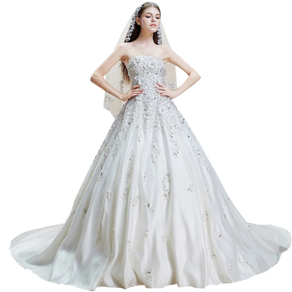 A full satin column gown with full lace applique. Illusion lace and tulle neckline and full fitted sleeve for the more demure bride. Shown with the full tulle skirt overlay which can be worn for the ceremony. This can then be removed and a simple tulle train worn at the back of the dress for the reception, removing all for the evening celebrations allowing for ease of movement and dancing! Shown in Ivory satin with Ivory tulle and lace applique overlay.Also available in Blush / Ivory, Champagne / Ivory, Vanilla / Ivory All gowns come with our customised inner bodice to enhance shape. You May Need These Cathedral Long Crystals lace Edge Veils For Your Romantic Wedding Party Dresses