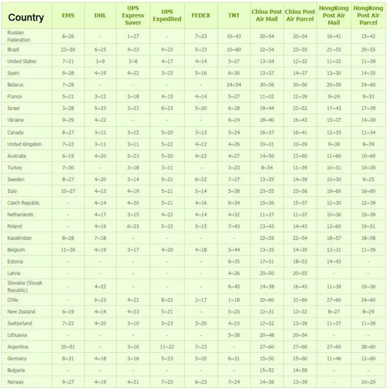 1. WORLDWIDE SHIPPING.(Except some countries and APO/FPO)2. Orders processed timely after the payment verification. 3. Our regular shipping method is China post register air mail, the shipping is slow for Brazil and other latin American countries, sometimes need 45-90 days, so please take it into consideration. For the clients from Russia/USA/United Kingdom/Canada/France/Israel/Saudi Arabia/Australia/Norway, we can send Epacket(if the parcel weight is within 2kg), it is fast, the regular delivery time is about 15 days, but sometime is not controllable, so if do not receive the parcel within 15 days, please be patient, thanks for your consideration 4. We only ship to confirmed order addresses. Your order address MUST MATCH your Shipping address.
