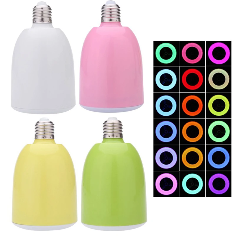New Mini Bluetooth Speaker E27 LED Smart Lighting Sound Music Speaker Box Bulb Audio for Samsung for Iphone Ipad Home Automation Main Features: 1. Bluetooth LED Speaker combines LED light and bluetooth speaker together, makes your life more colorful and wonderfu! 2. 3 Scene Mode and More Than 1000 colors flash can work simultaneously, 18 colour lights change along with music to a relax atmosphere. 3. Unique Sleep Assistant mode may help you turn off wireless speaker and light automatically after preset, have a good sleep without other\'s help. 4. Adopts E27 lamp base, very easy to operate. Light brightness, bluetooth on-off, music play & stop and music volume are adjustable controlled by mobilephone application, rather than one more remote controller. Energy saving and ECO-friendly. 5. Wireless bluetooth LED bulb speaker\' transmission range can be up to 10 meters. Pure digital technologies, provides the purity and clarity of music to you. 6. More Than 1000 Colour optional light color. APP operation is simple. Full frequency range loudspeaker, powerful, deep bass,rich 3D site feel, 360 degree surround sound. Let PARTY atmosphere has been High 7. When the outdoor barbecue, do not have to worry about Bluetooth speakers have no electricity. Date to create a warm atmosphere. Product Parameters: