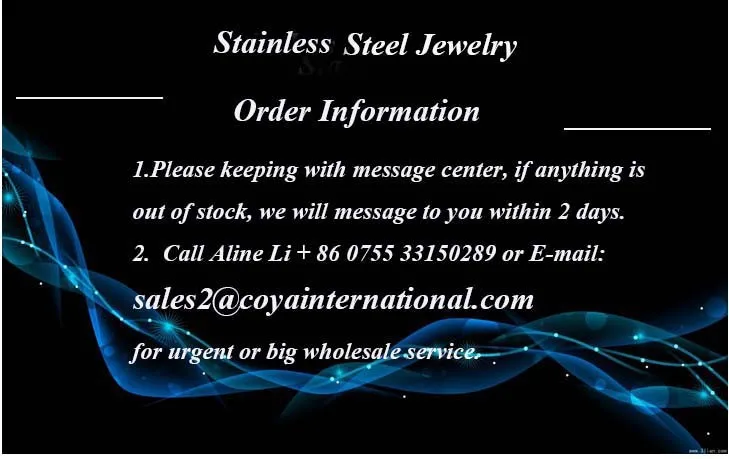 We are the manufacturer & exporters of stainless steel jewelry. Our high quality products includes: ring, pendant, earring, necklace, bracelet, bangle, cufflink, etc. All can be made in stainless steel. We can produce in customer\'s design and requirement.If you are interested in our products, you are warmly welcomed to contact us for more details!