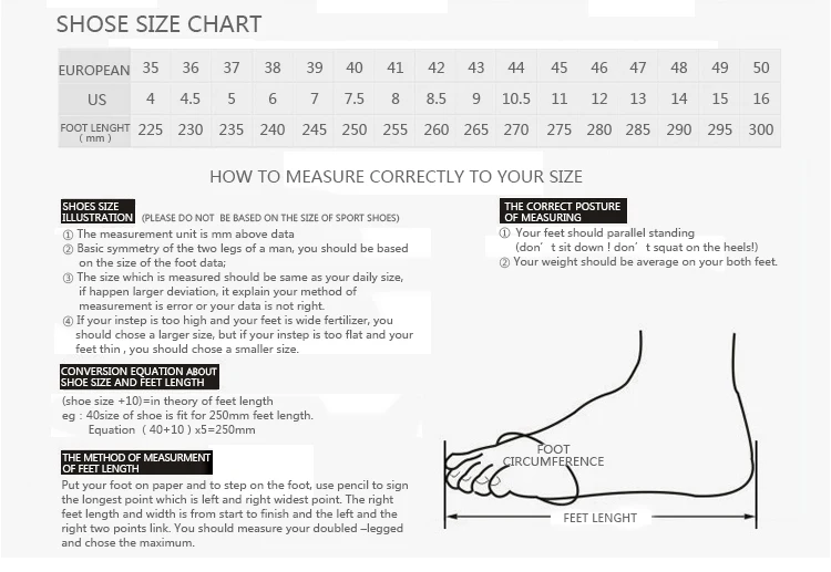 Size Note: Please make sure and choose size by your foot length! So you only need to accurately measure feet length, and then refer to the size chart to choose the correct size.Our company is EUR size and Foot length (marked on the shoe size lable) as the standard.