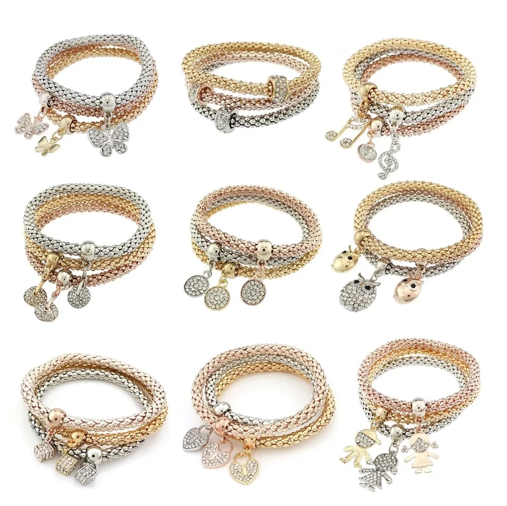 3Pcs/set Fashion Jewelry Accessories Elegant Dice Butterfly Owl Heart Friendship Rhinestone Gifts Charm Bracelets For Women
