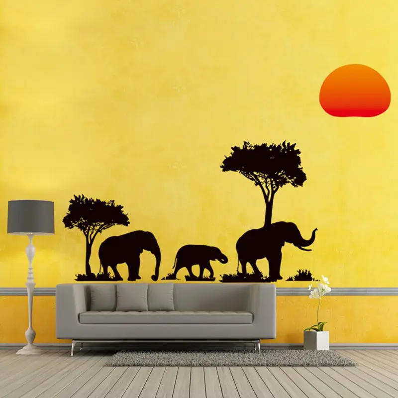 Africa Grassland Cartoon Black Elephant Tree Red Sun Wall Stickers Kids Rooms Bedroom Adesivo De Parede Decoration Home Decor Material:Nontoxic PVC which is removable without residue remaining on the surface.Feature:a contemporary way to complement your home or business interior design. Self-adhesive, water resistant and removable, suitable for most flat smooth surfaces without leaving residue,however a pre-test is highly recommended.