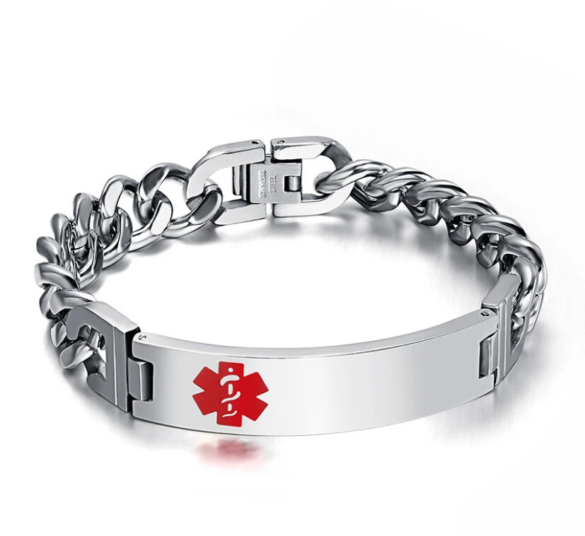 Medical Alert ID Bracelet for Men in Stainless Steel Custom Engraved Metal Tag