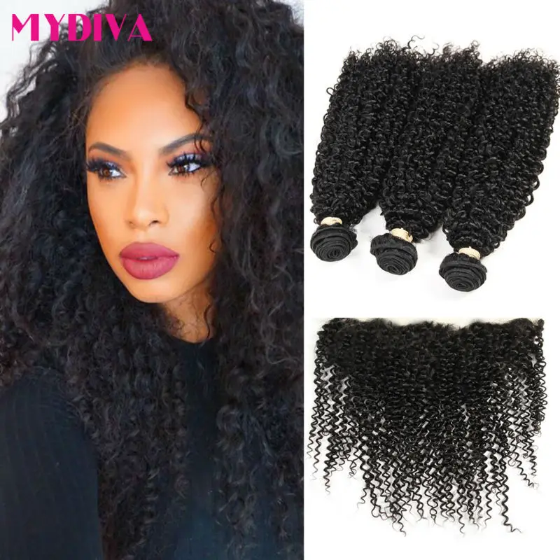 Mongolian Kinky Curly Hair With Closure Lace Frontal Weave 3 Bundles With Frontal Closure 7A Lace Frontal Closure With Bundles