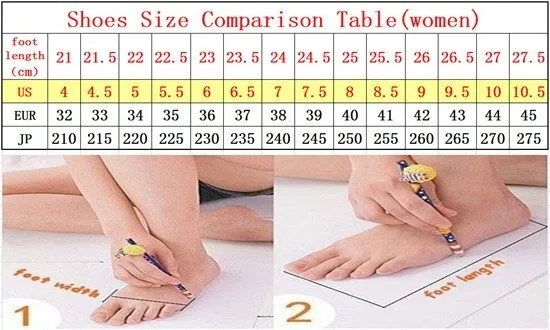 Our product size standard US 4=EUR 32=210mm(bare feet length) US 4.5=EUR 33=215mm(bare feet length) US 5=EUR 34=220mm(bare feet length) US 5.5=EUR 35=225mm(bare feet length) US 6=EUR 36=230mm(bare feet length) US 6.5=EUR 37=235mm(bare feet length) US 7=EUR 38=240mm(bare feet length) US 7.5=EUR 39=245mm(bare feet length) US 8=EUR 40=250mm(bare feet length) US 8.5=EUR 41=255mm(bare feet length) US 9=EUR 42=260mm(bare feet length) US 9.5=EUR 43=265mm(bare feet length) US 10=EUR 44=270mm(bare feet length) US 10.5=EUR 45=275mm(bare feet length) (1 inch=2.54 cm ,1 cm=0.3937 inch,1cm=10mm)